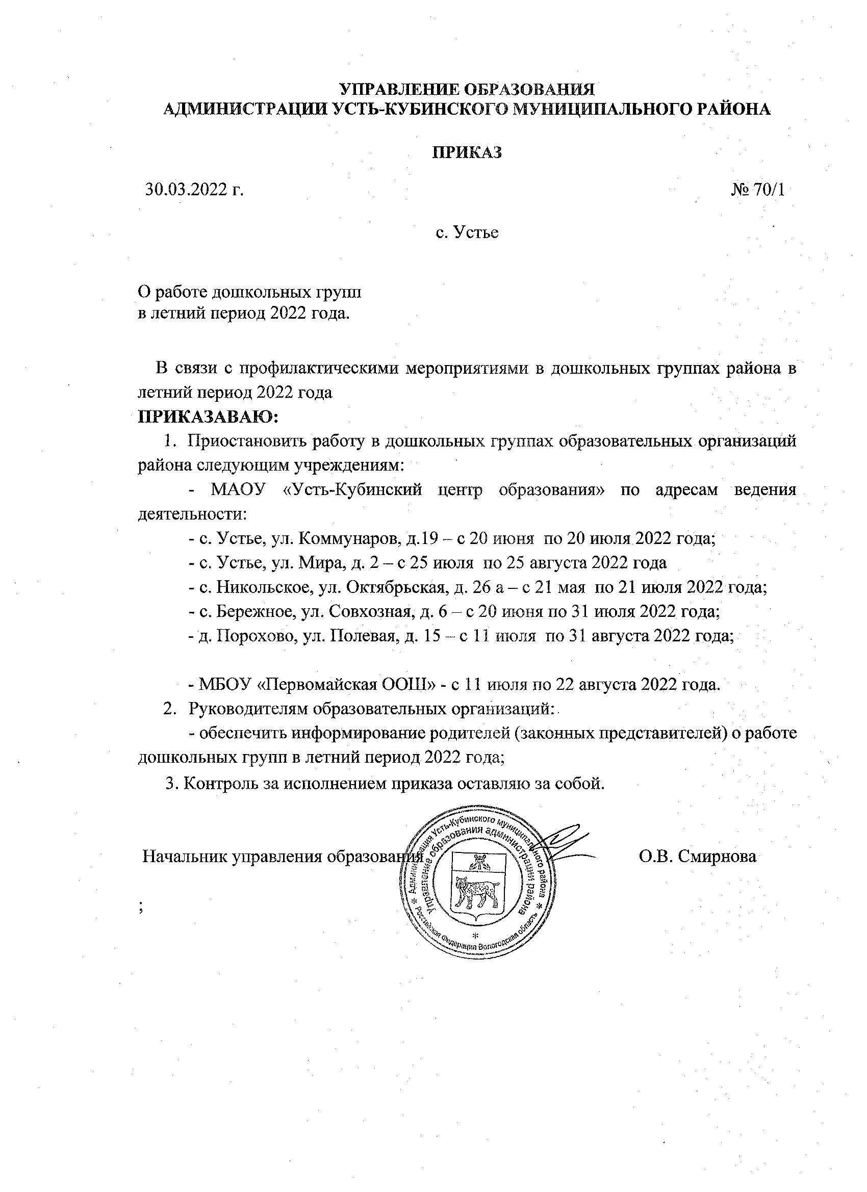Приказ № 70/1 от 30.03.2022 О работе дошкольных групп в летний период 2022 года