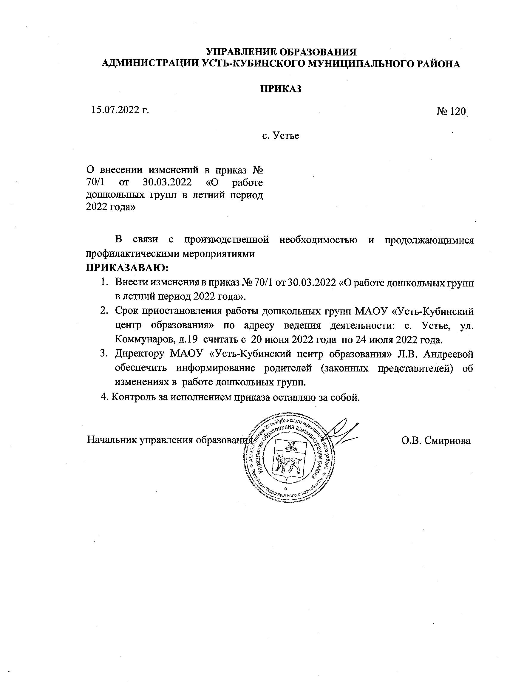 Приказ № 120 от 15.07.2022 О внесении изменений в приказ № 70/1 "О работе дошкольных групп в летний период 2022 года"