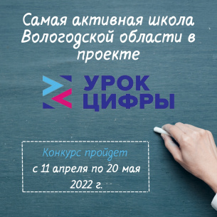Департамент цифрового развития Вологосдкой области приглашает школы региона принять участие в конкурсе «Самая активная школа Вологодской области в проекте «Урок цифры». Конкурс пройдет с 11 по 30 апреля 2022 года в рамках завершающего «Урока цифры» в 2021/22 учебном году.
