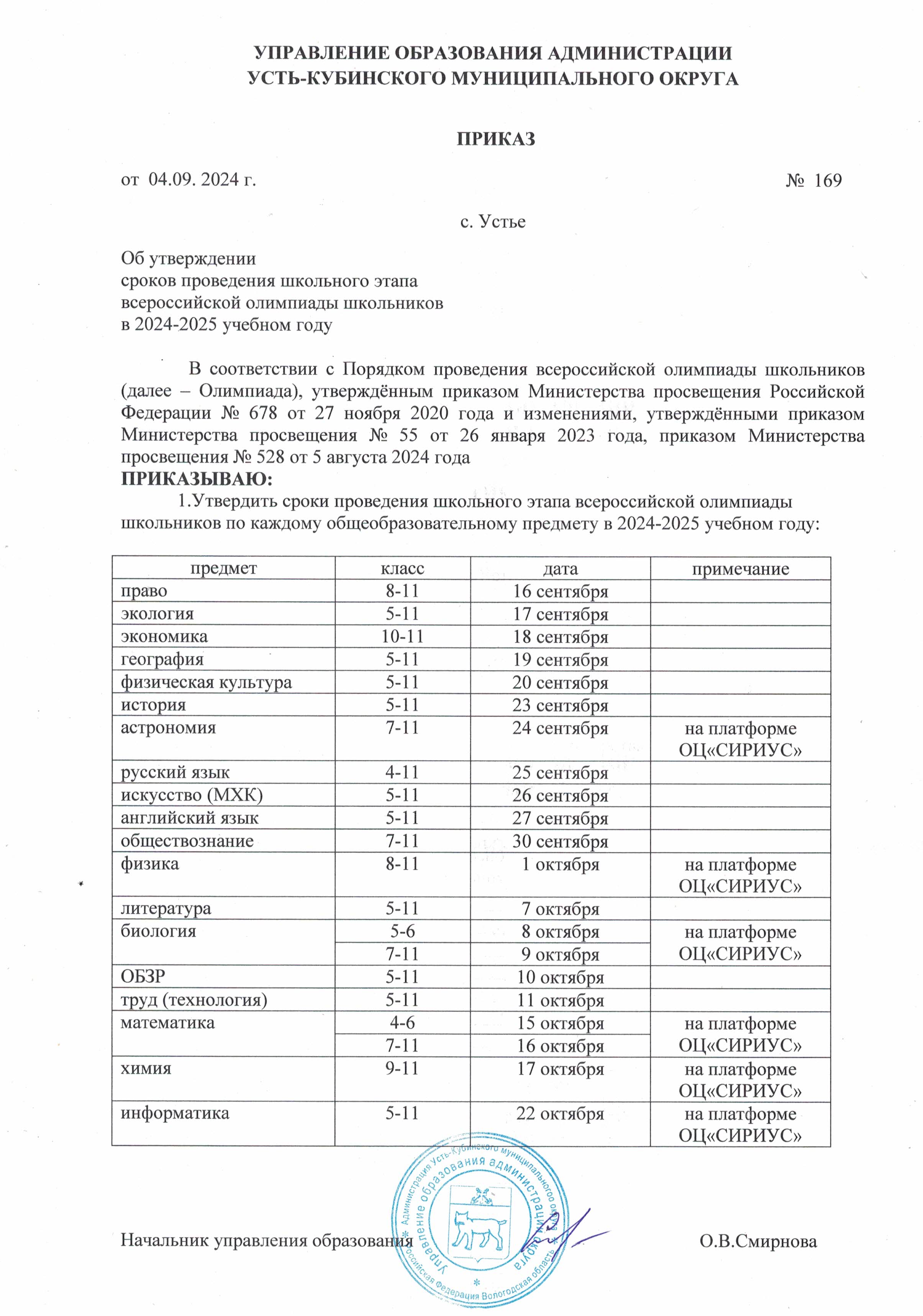 Приказ 169 от 04.09.2024_Об утверждении сроков проведения ШЭ ВсОШ в 2024-2025 учебном году
